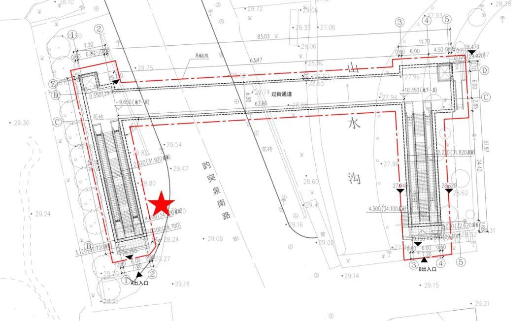 为改善这一状况,济南市早在今年4月就对外公示了泉城广场城市智慧停车场建设项目的相关规划,其中明确包含了连接两处景点的地下通道部分。根据规划内容,通道选址于历下区趵突泉南路,具置在趵突泉公园东门北侧与泉城广场西北角之间。从设计图上看,通道主体跨度约63米,宽度接近7米,整体跨度总计约83米。在两端分别设置了A、B两处出入口,每处均配备了两部自动扶梯和一条人行步梯,以方便各类人群通行。