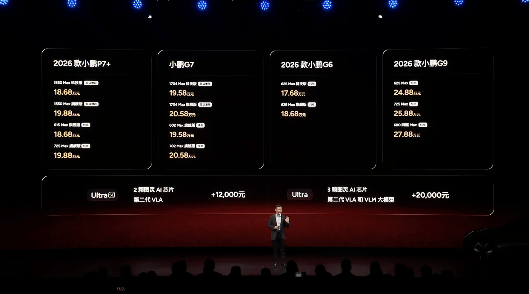 2026款小鹏G6和小鹏G9整体都沿用现款车型的设计,主要换装小鹏自研图灵AI芯片。并可选Ultra SE和Ultra版本,后者支持小鹏第二代VLA辅助驾驶能力。