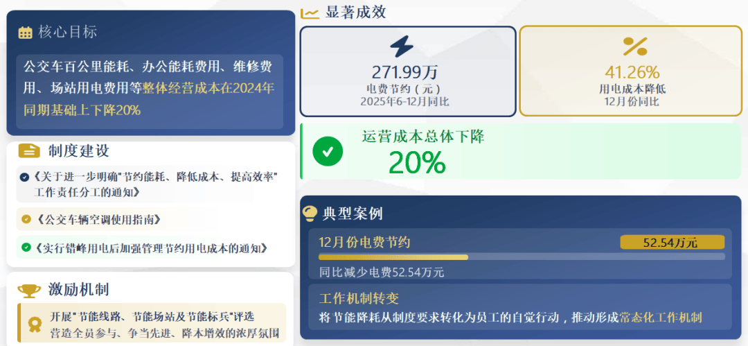 公司深挖内部潜力,优化管理流程,提升运营效能,深入动员全体干部职工牢固树立“过紧日子”的思想,公司常态化开展“节约能耗 降低成本 提高效率”活动,科学制定了“公交车百公里能耗、办公能耗费用、维修费用、场站用电费用等整体经营成本在2024年同期的基础上整体下降20%”的工作目标,先后印发了《关于进一步明确“节约能耗、降低成本、提高效率”工作责任分工的通知》、《公交车辆空调使用指南》、《实行错峰用电后加强管理节约用电成本的通知》等一系列具体操作文件,进一步细化了节能降耗的实施路径,同时开展“节能线路、节能场站及节能标兵”评选工作,进一步营造全员参与、争当先进、降本增效的浓厚氛围,将节能降耗从制度要求转化为员工的自觉行动,推动形成常态化的工作机制,实现了运营成本总体下降20%的目标。以节能降耗工作为例:2025年6到12月份企业电费较2024年同期节约了271.99万元,其中12月份同比减少电费52.54万元,用电成本降低41.26%,活动取得显著成效。四是积极拓展三产多元化经营新路径。为最大限度的减轻政府财政压力、维持企业正常运转、保障人民群众出行,近年来公司积极开拓三产市场,业务范围涵盖公交广告、汽车维修、公交驾培、新能源汽车服务、充电桩对外充电、城乡客运、出租车、定制公交、机动车拆解与销售业务