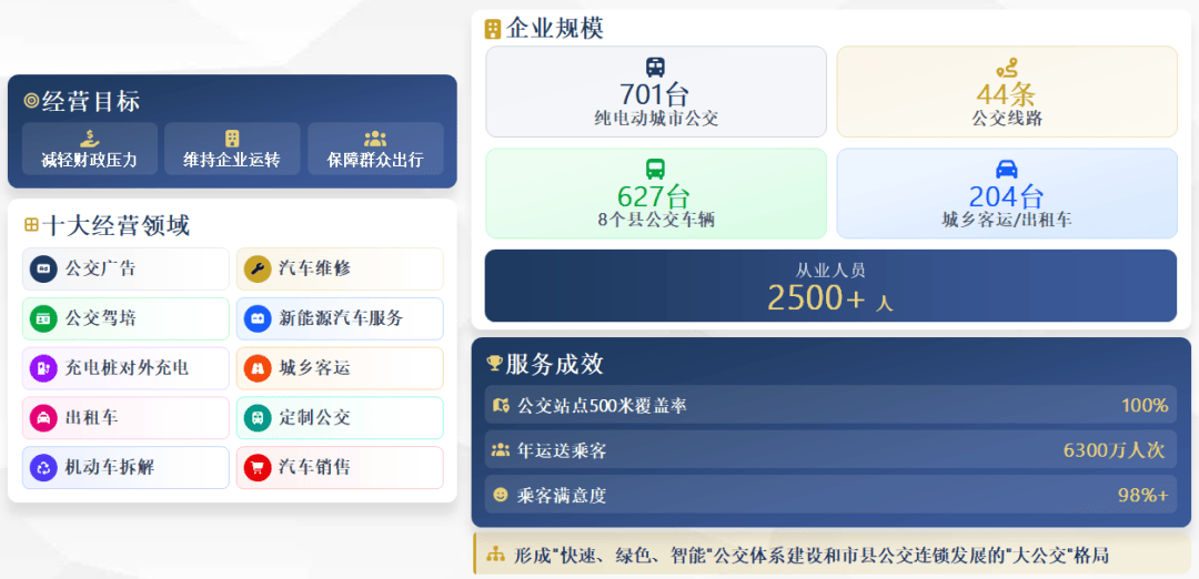 年市定民生实事,通过“政府主导推动、多部门协同发力、加大宣传倡导、公交主动作为”等有效举措,目前公司已在我市主城区27所学校开通了114条通学定制公交专线多名中小学生提供了“一站直达式”的往返通学公交出行服务,车辆准点率达100%,学校周边电动车、小汽车每天减少近4万台次,有效缓解了市区交通拥堵,解决了家长接送难题,保障了学生出行安全,提高了政府公共服务能力,同时也增加了企业经营收益,减少了政府财政补贴压力,通学定制公交服务赢得广大学生、家长及社会各界的一致称赞,已成为“学校放心、家长省心、学生舒心、社会满意”的民生工程“金名片”。二、创新改革管理模式,推动企业经营向多元化发展为更进一步优化企业经营管理模式,解决当前经营成本过大、工作效率不高、管理缺乏创新等突出问题和矛盾,近年来我们通过进一步深化运营管理体制改革、强化AI赋能、大力开展创新增收节支等有效举措,取得了较好成效。