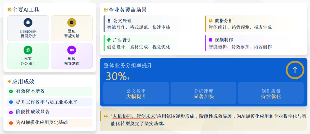 AI技术与主营业务深度融合,主要应用了DeepSeek、豆包、元宝、剪映等AI软件,使用场景包括公文处理、各类数据分析、广告设计、视频制作等全业务覆盖,整体业务分担率提升30%以上,在有效降本增效的同时,极大的提升了工作效率与员工业务水平,“人机协同、智创未来”的应用氛围逐步形成,阶段性成效显著,为AI规模化应用和企业数字化与智能化转型奠定了坚实基础。三是常态化开展“节约能耗 降低成本 提高效率”活动。为应对企业发展困境,2025年6