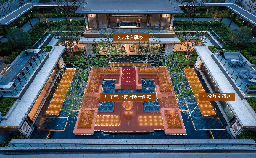 走进小区,你会感觉像走进了一个欧洲贵族庄园。景观由大师设计,有25米长的奢石水景、720㎡的下沉式“浮岛花园”、无风雨的连廊。每一处细节都充满艺术感,比如借鉴意大利法尔奈斯庄园的跳泉,组成了一个巧妙的“甲”字布局,寓意“苏州第一”,营造出独特的低密社区氛围。
