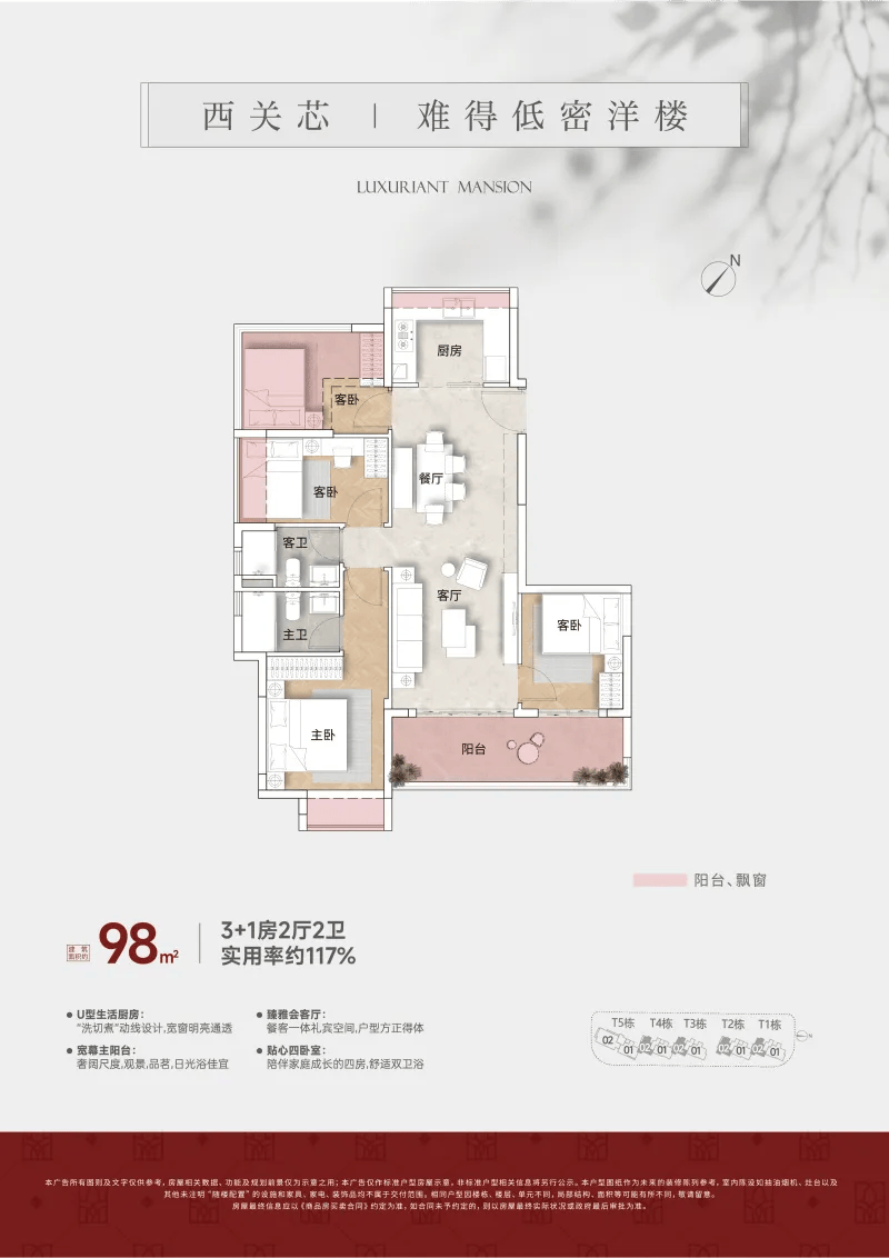 :可灵活改造为3+1房2卫格局,主卧带大尺度飘窗,客卧直连主阳台,采光与通风俱佳,适合三口之家或二胎家庭一步到位。